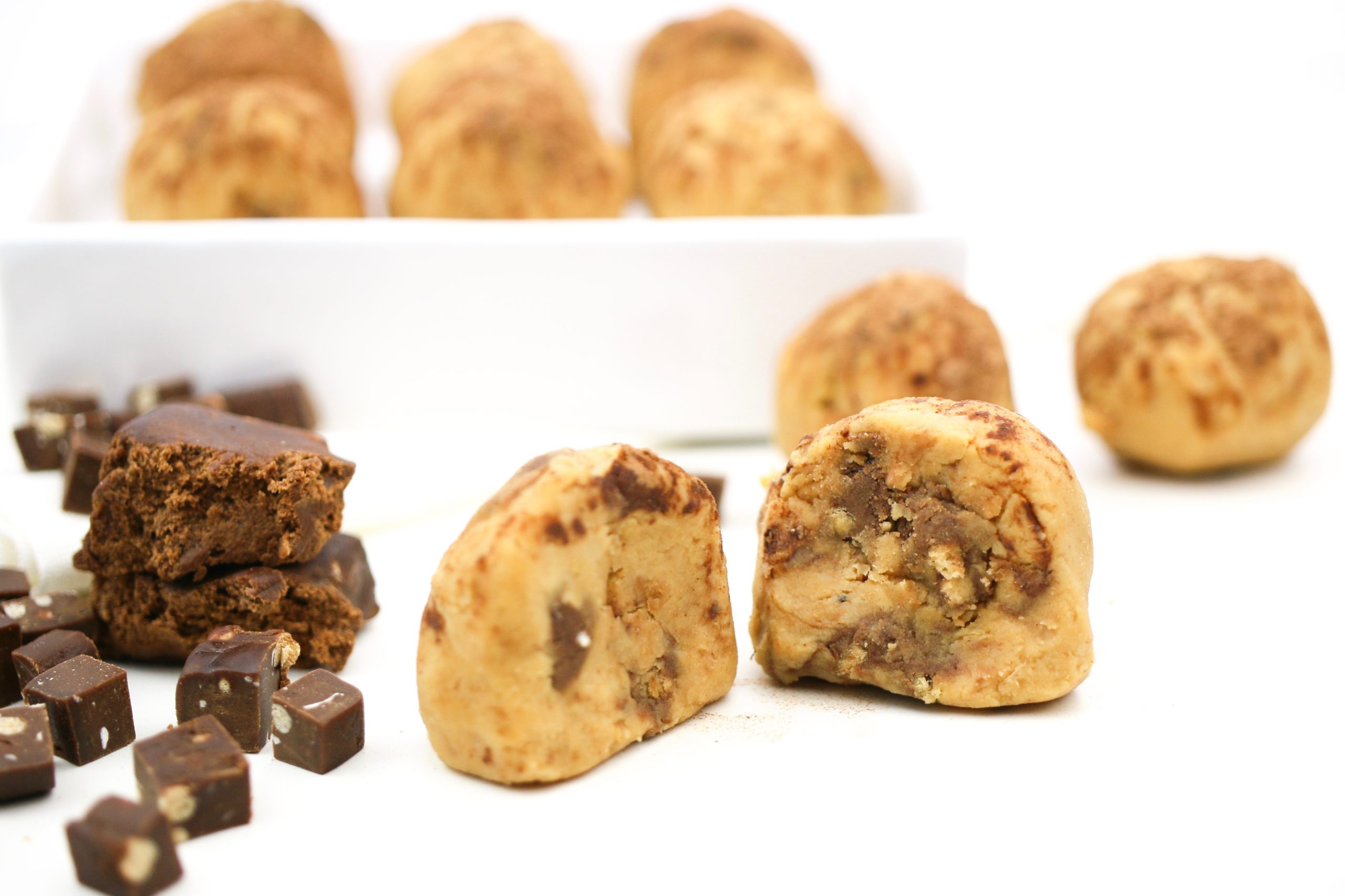 To do this, we needed to dissect what a chocolate truffle actually is. In the simplest sense, truffles are bite sized chocolate confections. They’re made by creating a silky chocolate “ganache” center, which is then rolled and coated with a number of different ingredients: melted chocolate, powdered sugar, sprinkles, crushed nuts or different candies. Traditionally, these would be round, and dusted with cocoa powder, which fun fact is where they got their name from, their resemblance to the delicacy of the same name.