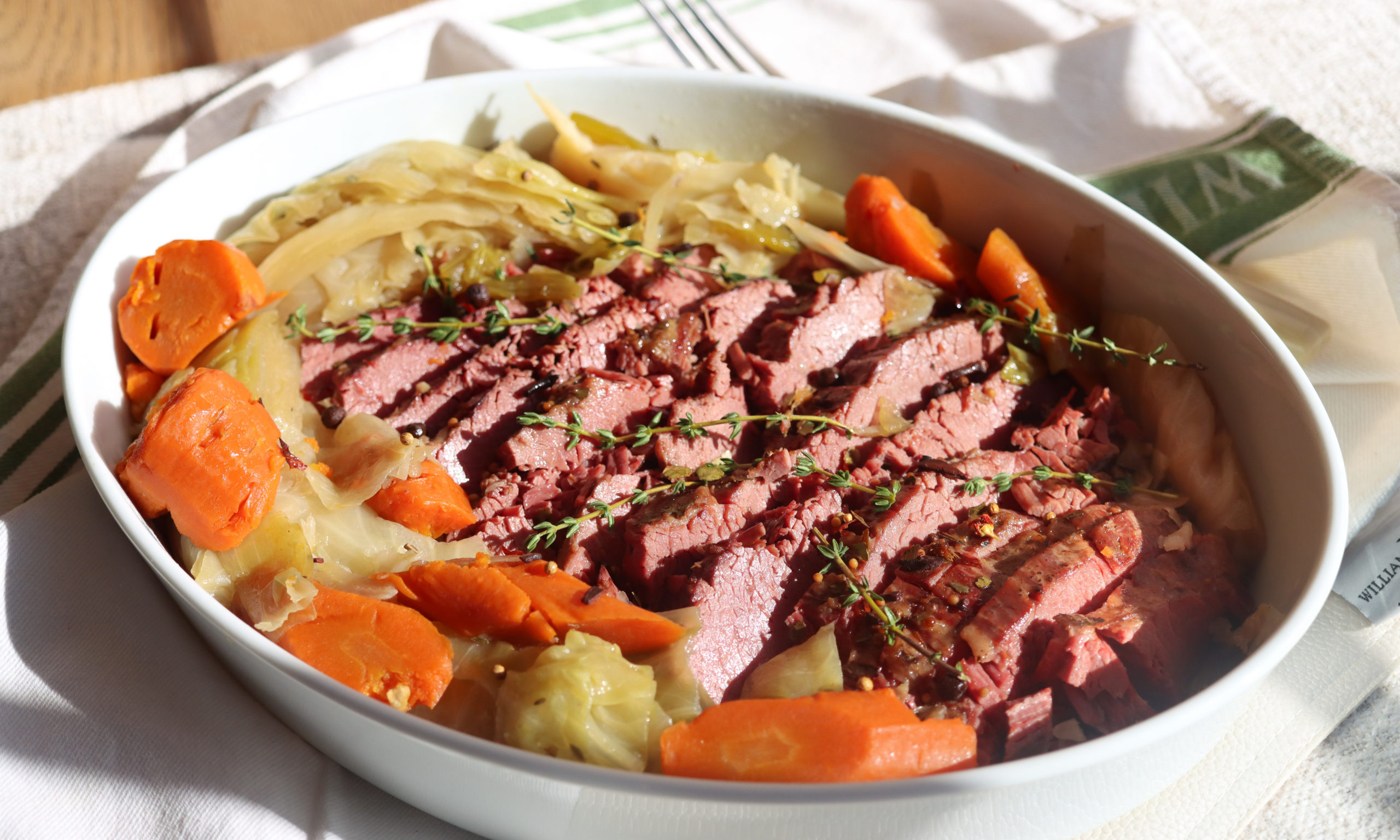 - Slice corned beef and serve with cooked vegetables.